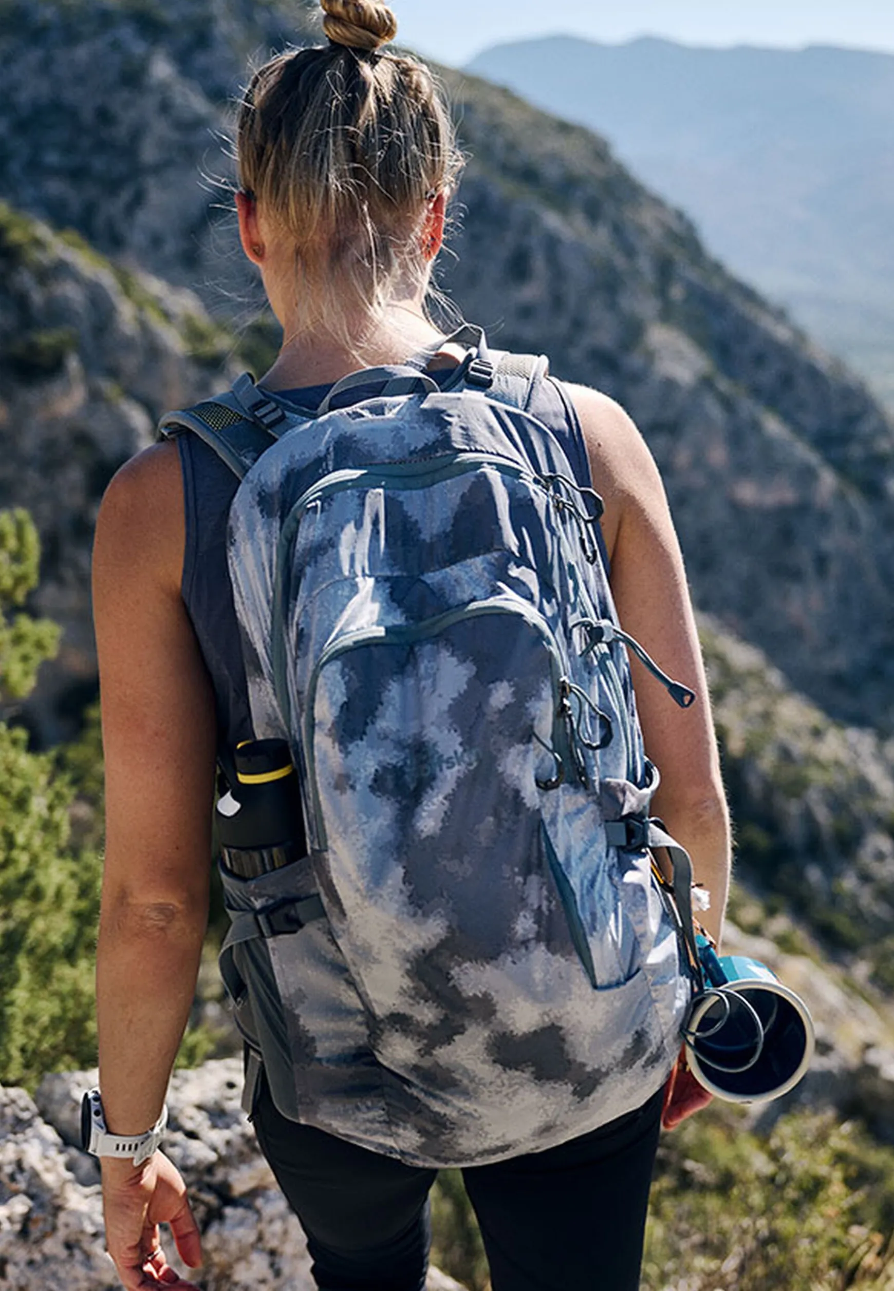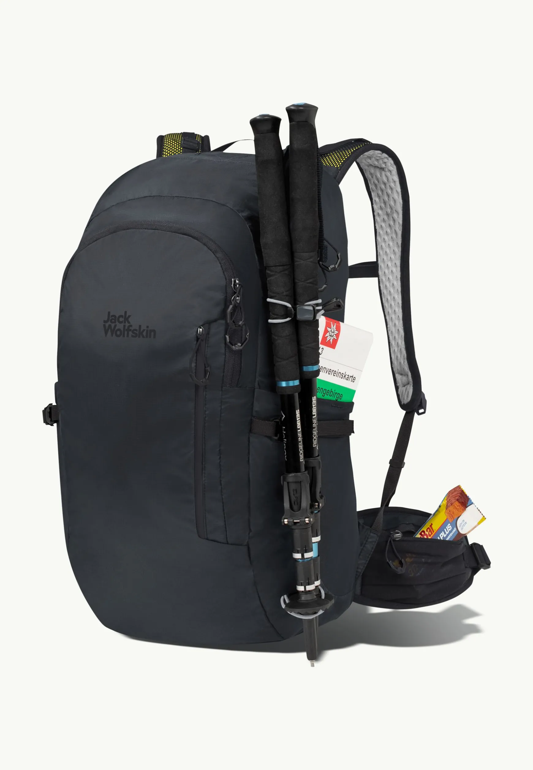 Das Innenfach im geräumigen Hauptfach bietet zusätzlich Platz für deine Trinkblase. Außerdem verfügt der Rucksack über eine separate Vortasche mit Einschubfächern und ein praktisches Reißverschlussfach auf der Front. In die zwei elastischen Netzseitentaschen passen große Trinkflaschen, die du mit den seitlichen Kompressionsriemen fixieren kannst. Am gepolsterten Hüftgurt ist eine elastische Netztasche mit Reißverschluss angebracht ist.