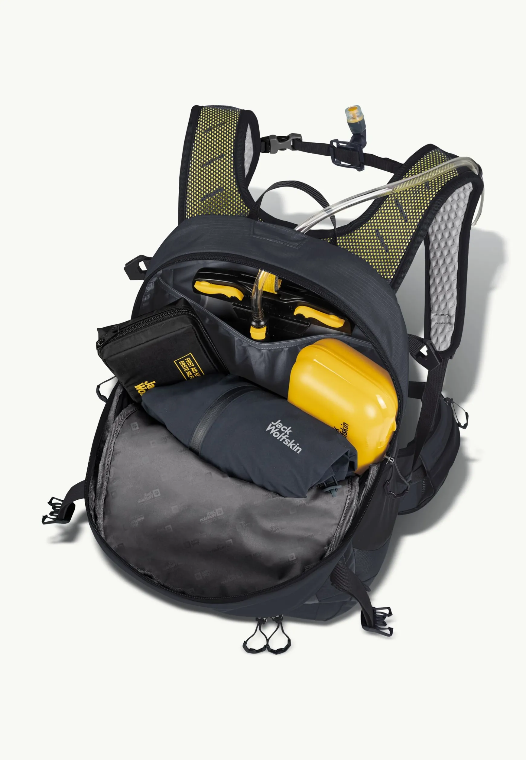 Die Einschubfächer in der Vortasche kannst du für Fahrrad-Werkzeug und -Zubehör nutzen, es gibt eine Befestigung für LED-Leuchte oder Luftpumpe. Das Hauptfach ist im vorderen Bereich elastisch und lässt sich dadurch ein Stückchen vergrößern. Außerdem ist hier Platz für eine Trinkblase. Die Helmfixierung ist in einem separaten Fach auf der Front untergebracht.
