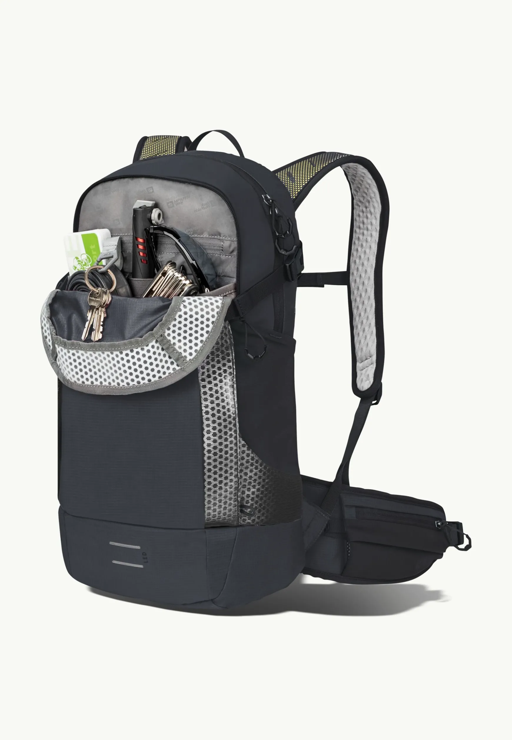 Am gesamten Rucksack und auf den Schultergurten sind umlaufend reflektierende Materialien mit besonders hoher Rückstrahlkraft verbaut.